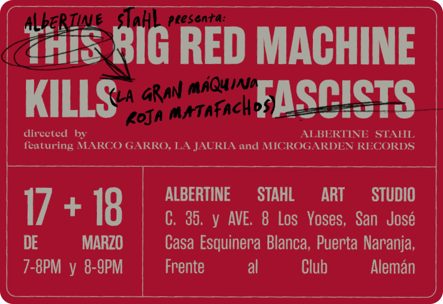 Arma de cinco filos, bestia de cuatro cabezas, hace de su canibalismo sobre unas ciertas arquitecturas, un acto crítico, un acto perfecto de arquitectura. Esta máquina se sirve de la arquitectura misma, del edificio “acabado”, como materia de trabajo. Más aún, devora y degusta a su propia estirpe. Vuelve la obra de su autor en su contra, al arrancarla del reino de la arquitectura para lanzarla al reino de las artes: el color que se vuelve palpable, el eco de lo cotidiano se vuelve sonido que transgresor, desde su carácter iconoclasta aflora la historia política, desde las artes visuales y de indumentaria, lo irreverente. El matar fascistas, como lo puede ser el matar amantes del arte conservador, es una broma que se toma con toda seriedad. Esta Gran máquina roja, como una hidra monstruosa, posee más de una cabeza: la de la artista Albertine Stahl, su cabeza original; sus cabezas sonoras, Microgarden Records y La Jauría, de las que no cesan de emanar ruidos infernales; y la del diseñador Marco Garro, que cobija y viste a los cuerpos que emanan de este averno a escala.